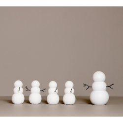 The white snow globe bears the classic silhouette of an iconic snowman with three small spheres stacked vertically.